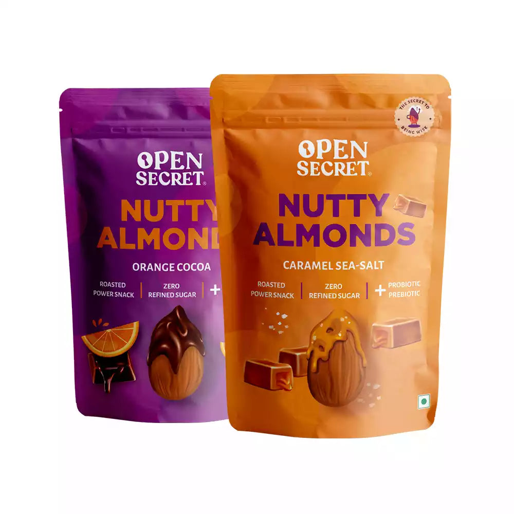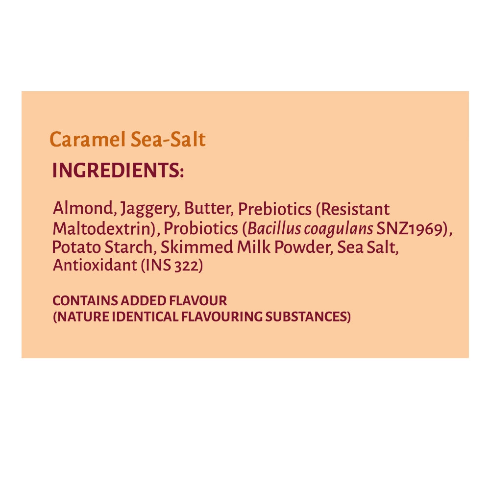 • Caramel Sea Salt Almonds: Almonds, Jaggery Powder, Butter, Prebiotics, and Probiotics