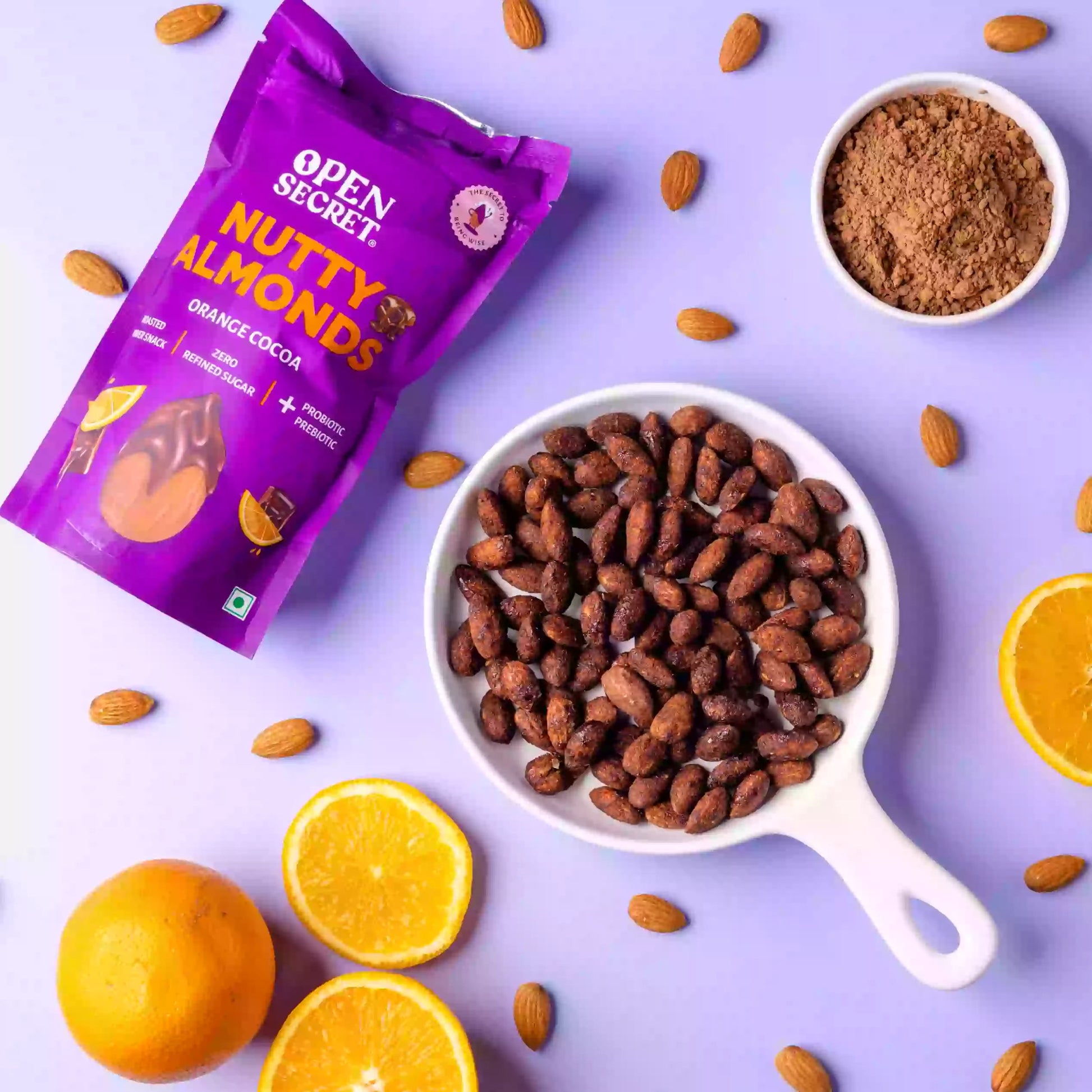 • Orange Cocoa Nutty Almonds: Almonds, Cocoa Powder, Prebiotics, and Probiotics
