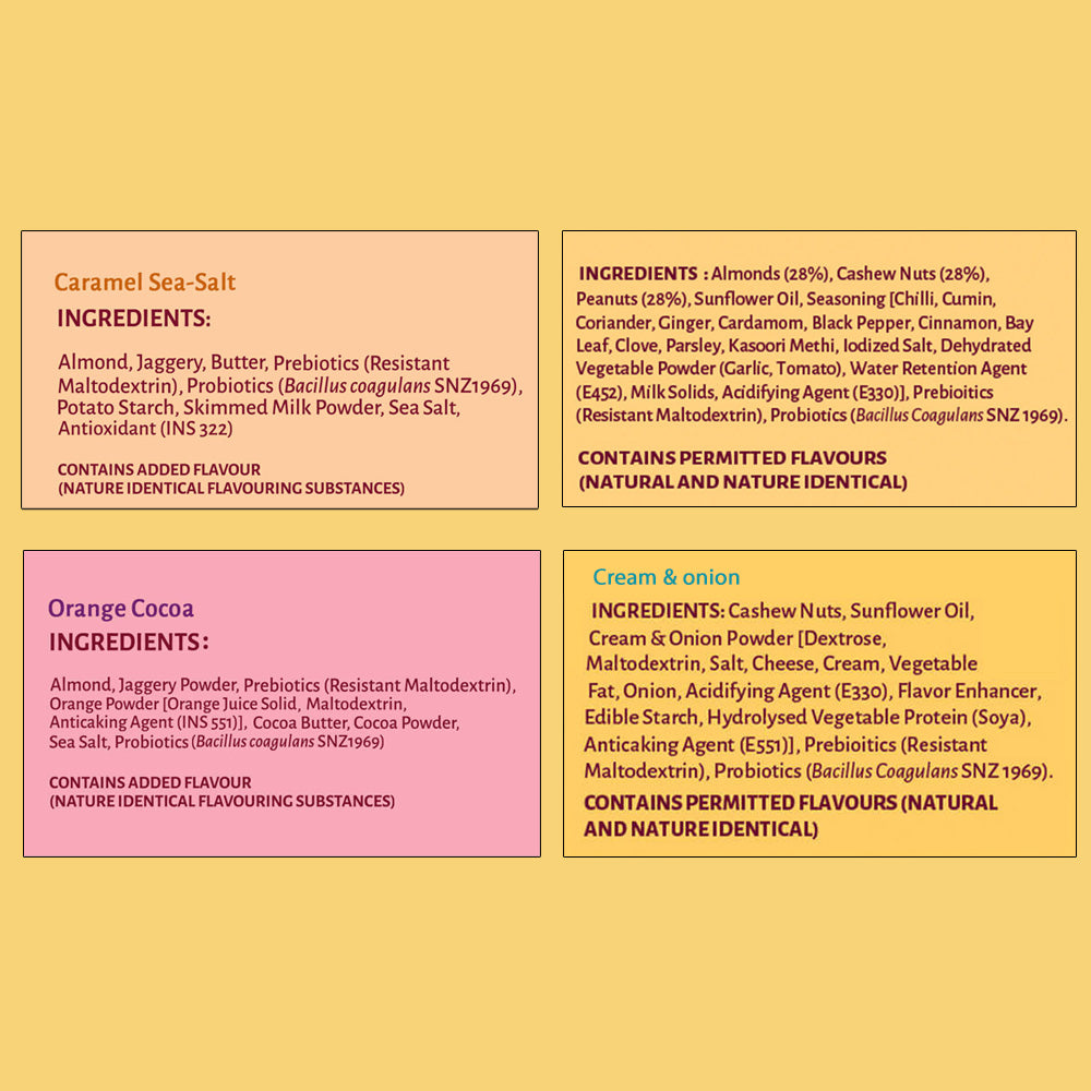 - Cream & Onion Nutty Cashews: Cashews, Sunflower Oil, Cream & Onion Powder, Prebiotics, Probiotics