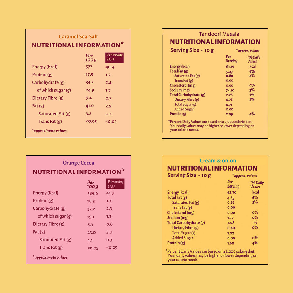 - Caramel Sea Salt Almonds: Almonds, Jaggery Powder, Butter