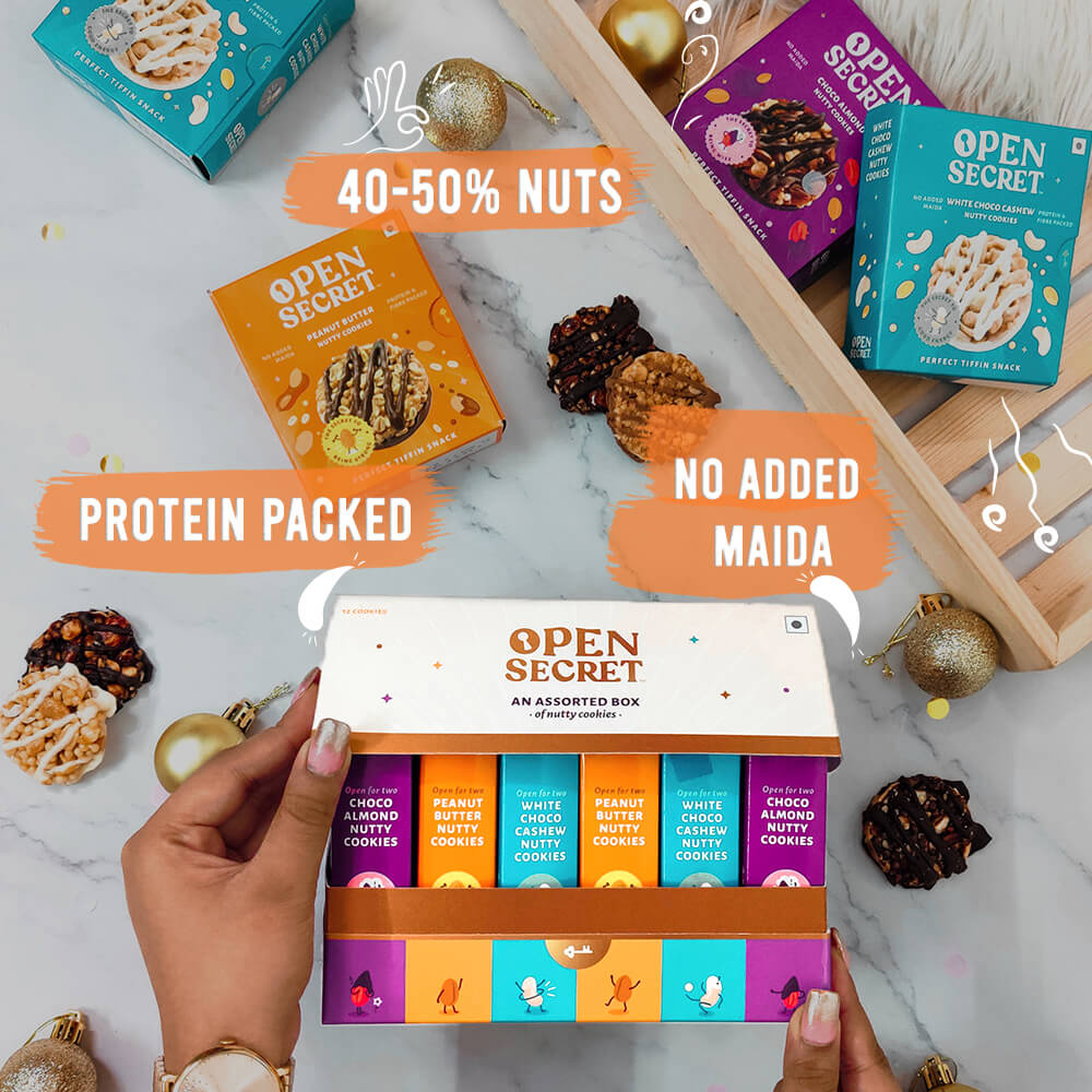 - 12 Assorted Handcrafted Nutty Cookies in the flavours Choco-Almond, Peanut Butter and White Chocolate Cashew (4 cookies each).