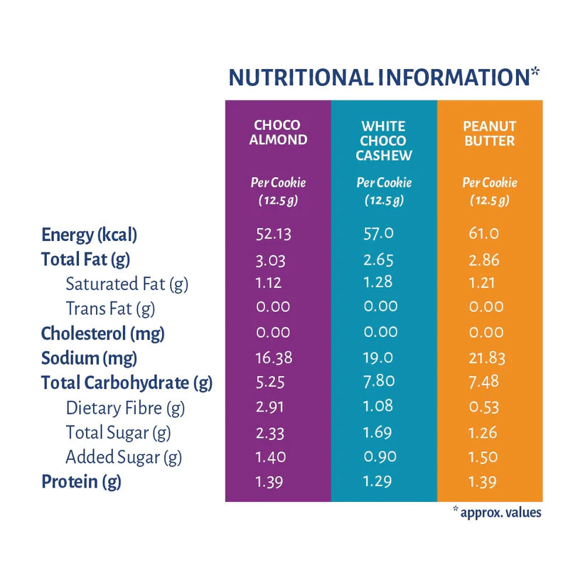 This pack contains a total of 12 delicious handcrafted cookies, in assorted flavors of Choco-Almond, Peanut Butter, and White Chocolate Cashew (4 cookies each).