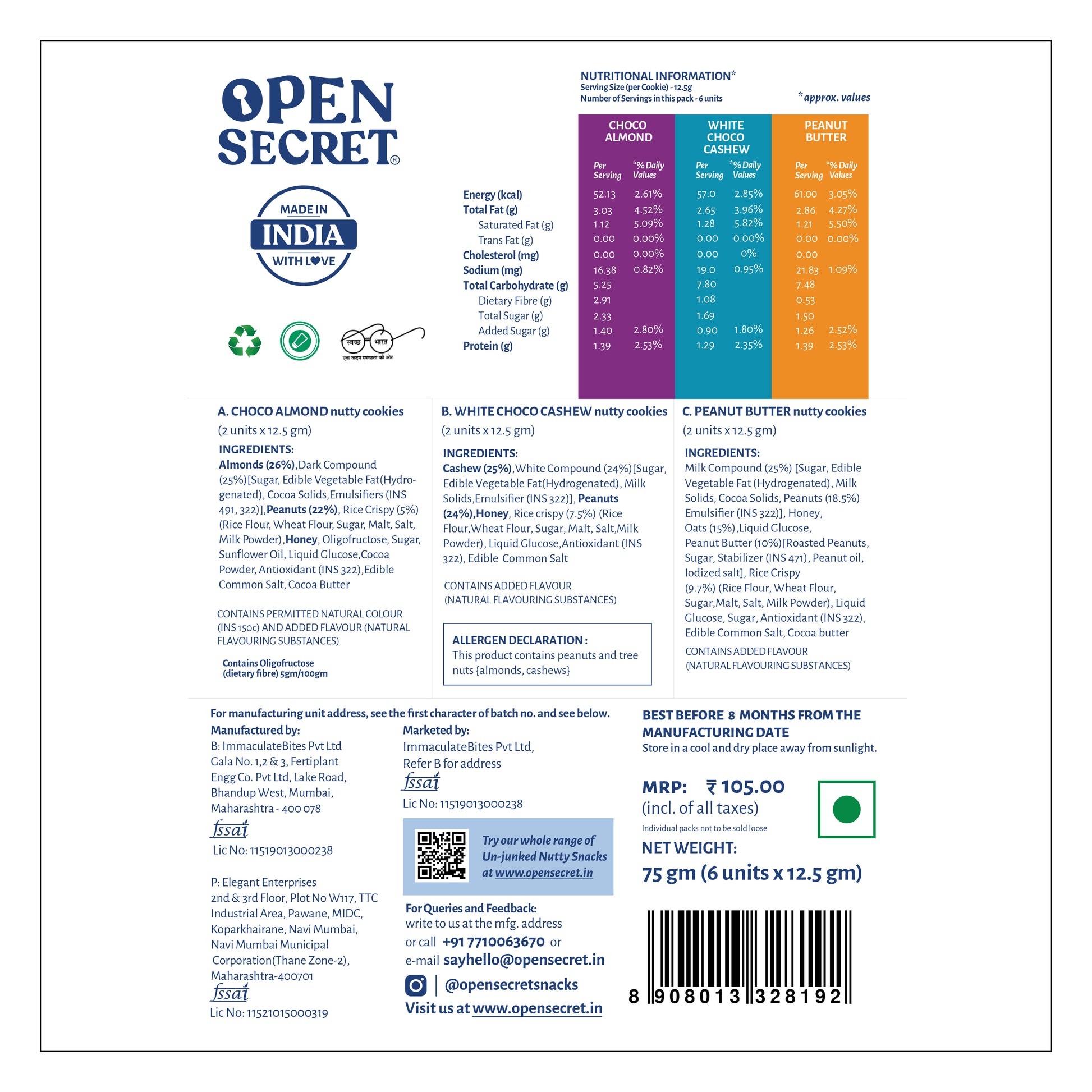 - Choco-Almond Cookies: Almonds, Peanuts, Rice Crispies.