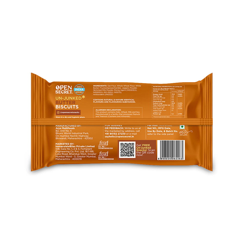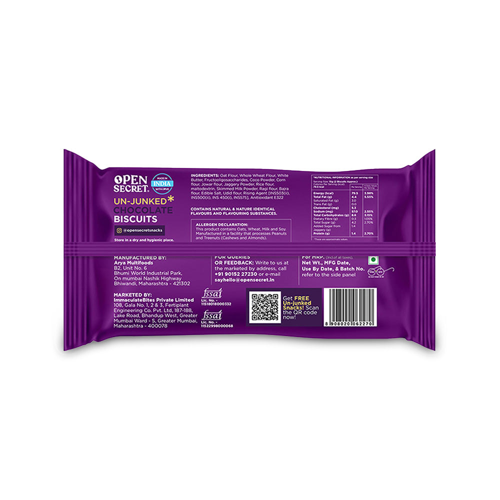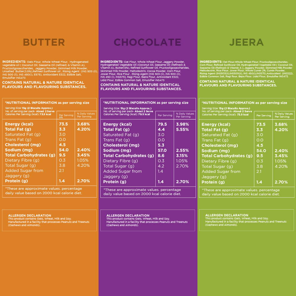 - Un-Junked Biscuits: Whole Wheat Flour, Oat Flour, Jowar Flour, Rice Flour, Butter, Jaggery Powder, Skimmed Milk Powder, Multigrain Flour, Cocoa Powder
