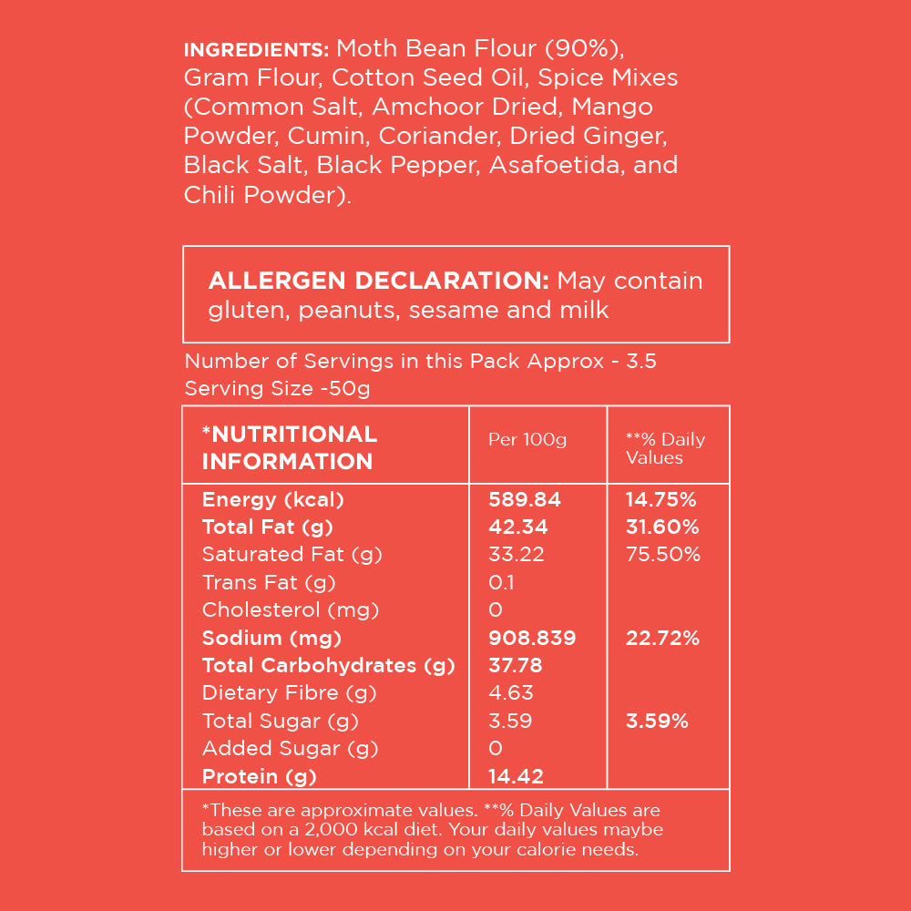 - Bhujia: Moth Bean Flour (90%), Gram Flour, Cotton Seed Oil, Spice Mixes (Common Salt, Amchoor dried, Mango powder, Cumin, Coriander, Dried Ginger, Black salt, Black pepper, Asafoetida and chilli powder)