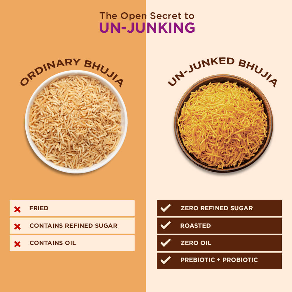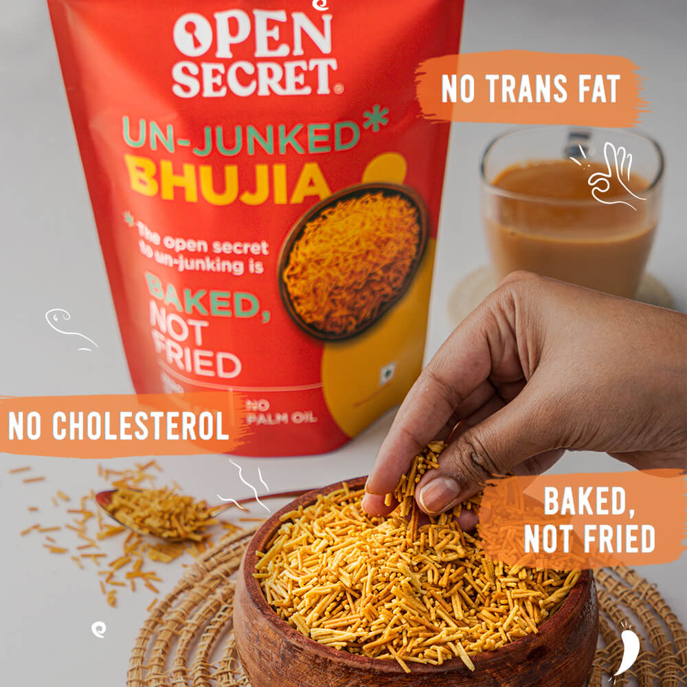 - Un-Junked Bhujia is BAKED, not Fried, has Zero Palm Oil and has Zero Trans Fat & Zero Cholesterol!