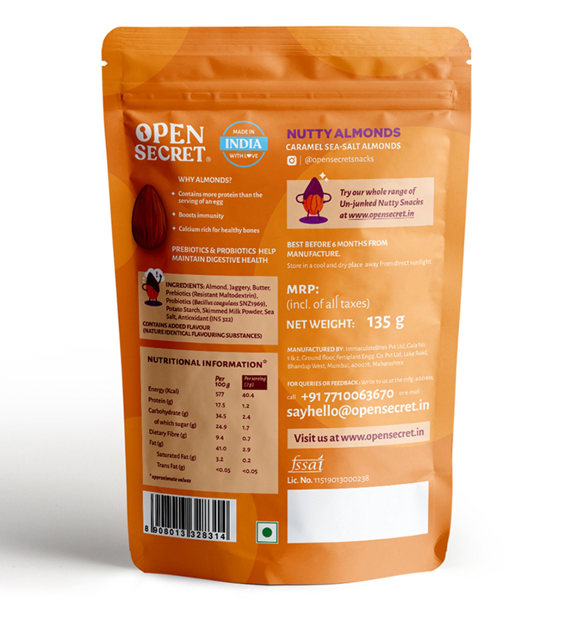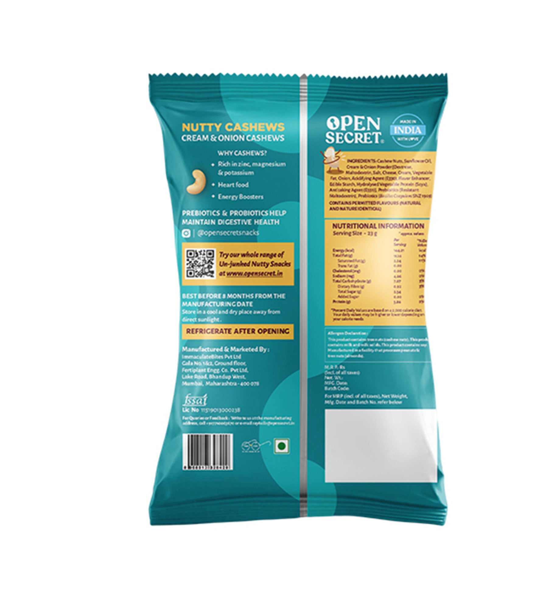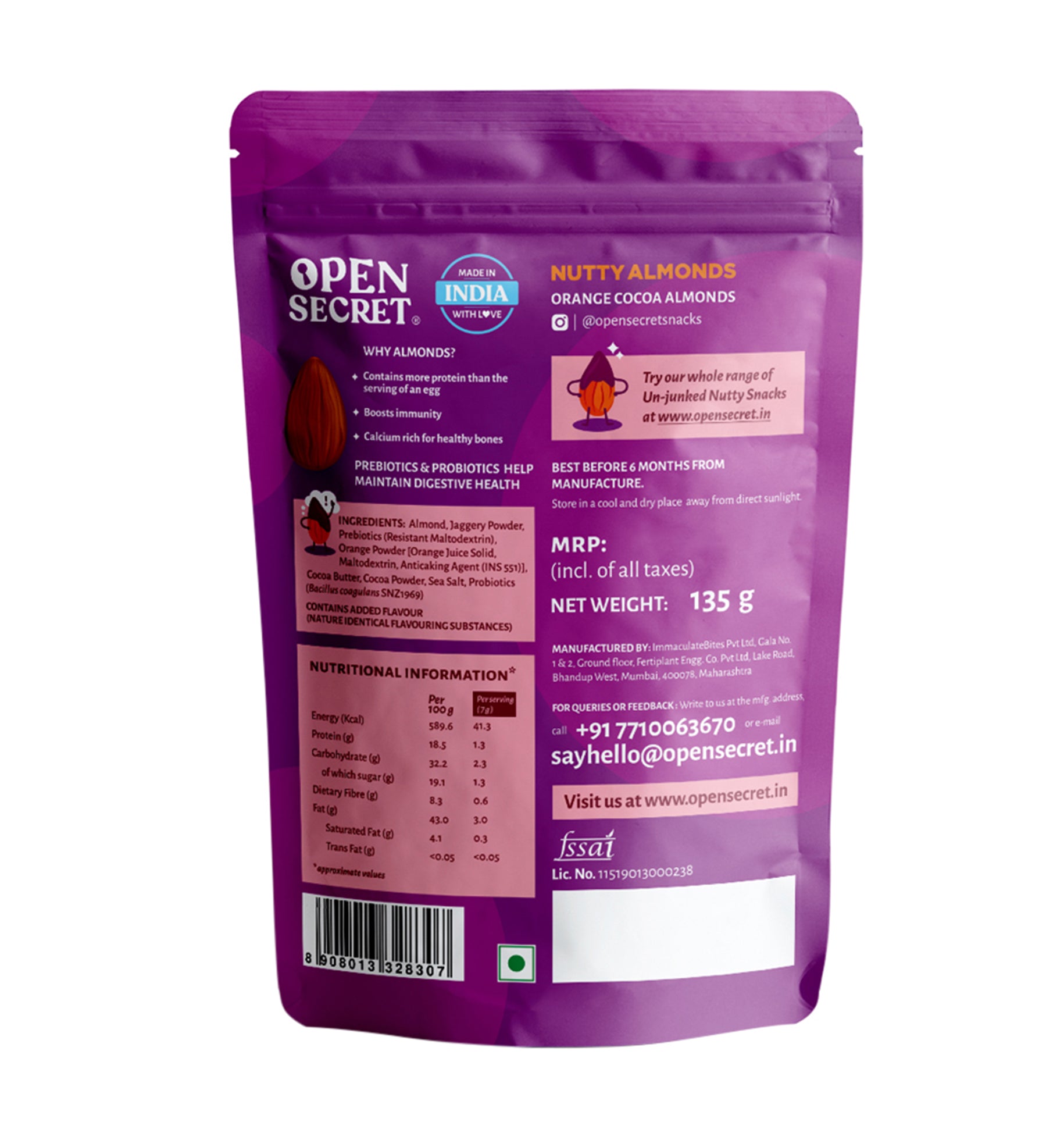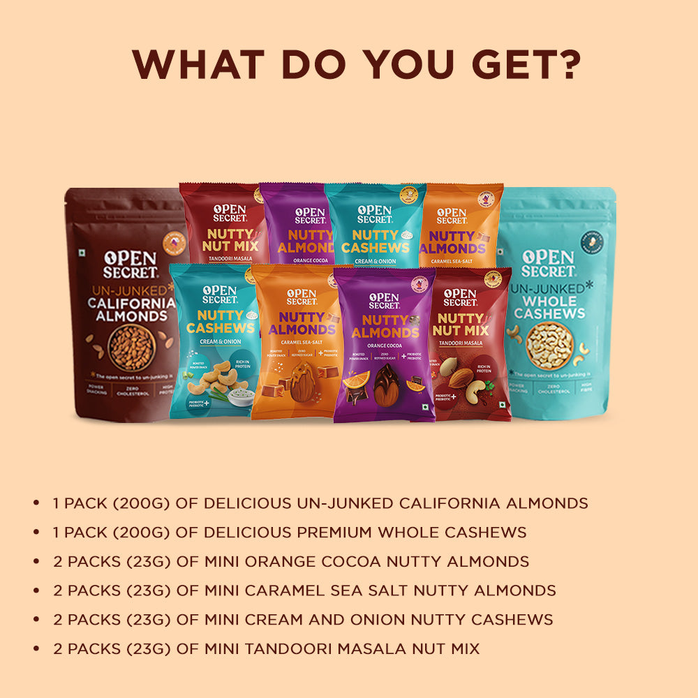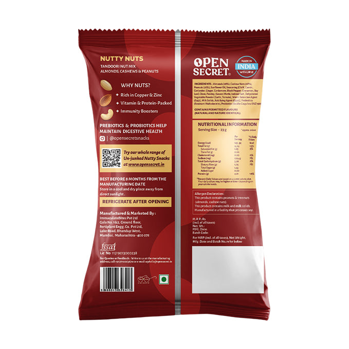 - Open Secret Flavoured Nuts are coated with Prebiotics & Probiotics to keep your gut healthy. Plus, they’re roasted, not fried.
