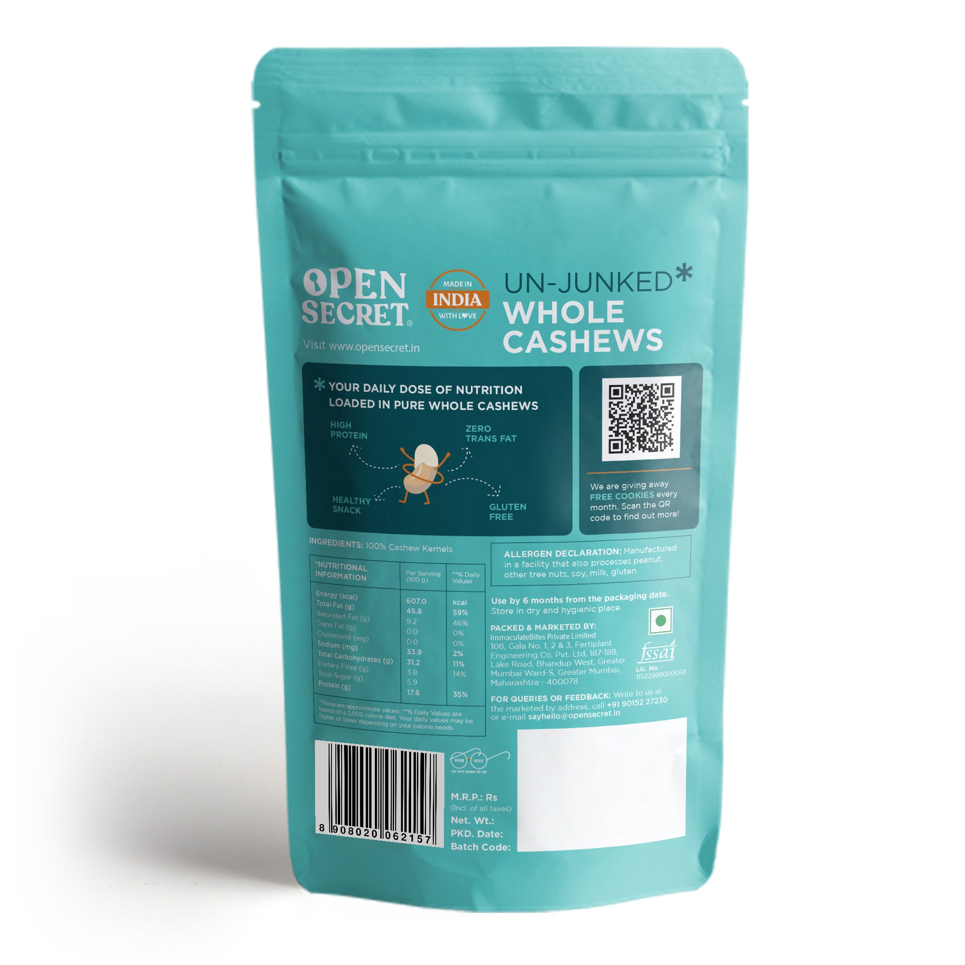 - Cashews: 100% Whole Cashew Kernels