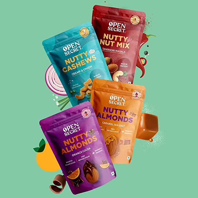 - Orange Cocoa Nutty Almonds: Almonds, Jaggery Powder, Prebiotics, Orange Powder