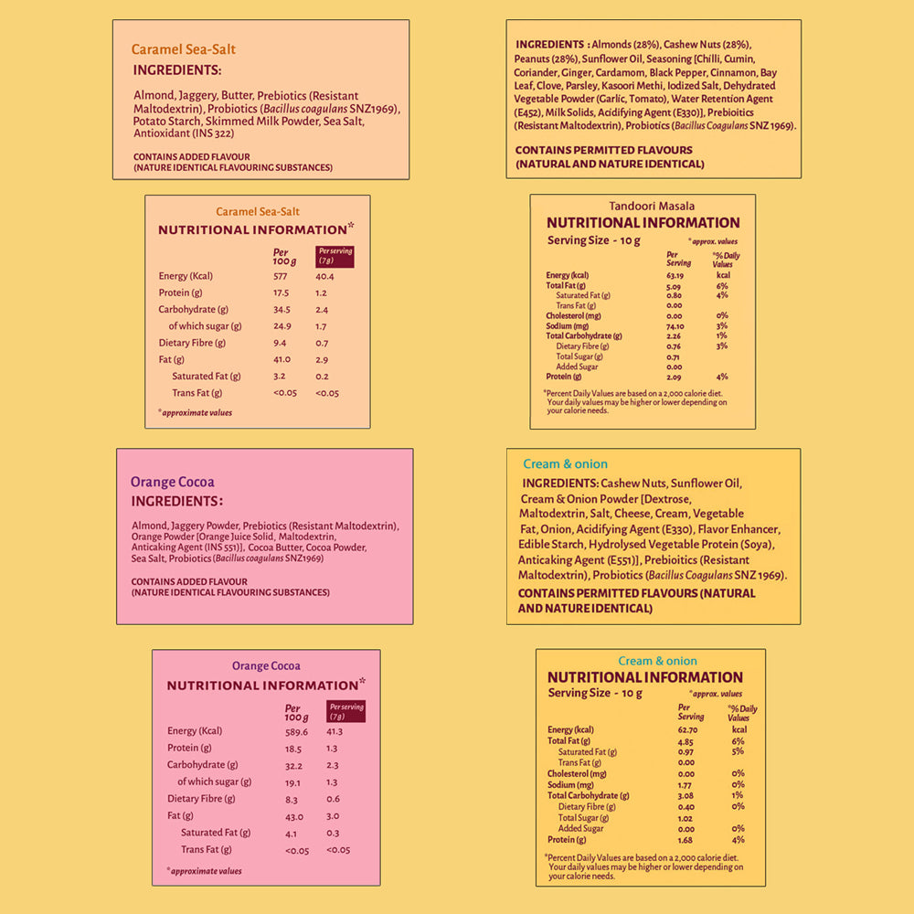 - Caramel Sea Salt Almonds: Almonds, Jaggery Powder, Butter