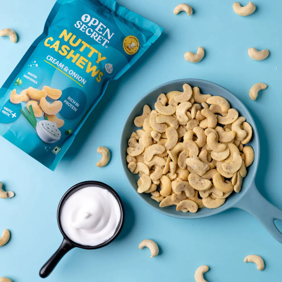 - Cream & Onion Nutty Cashews: Cashews, Sunflower Oil, Cream & Onion Powder, Prebiotics, Probiotics