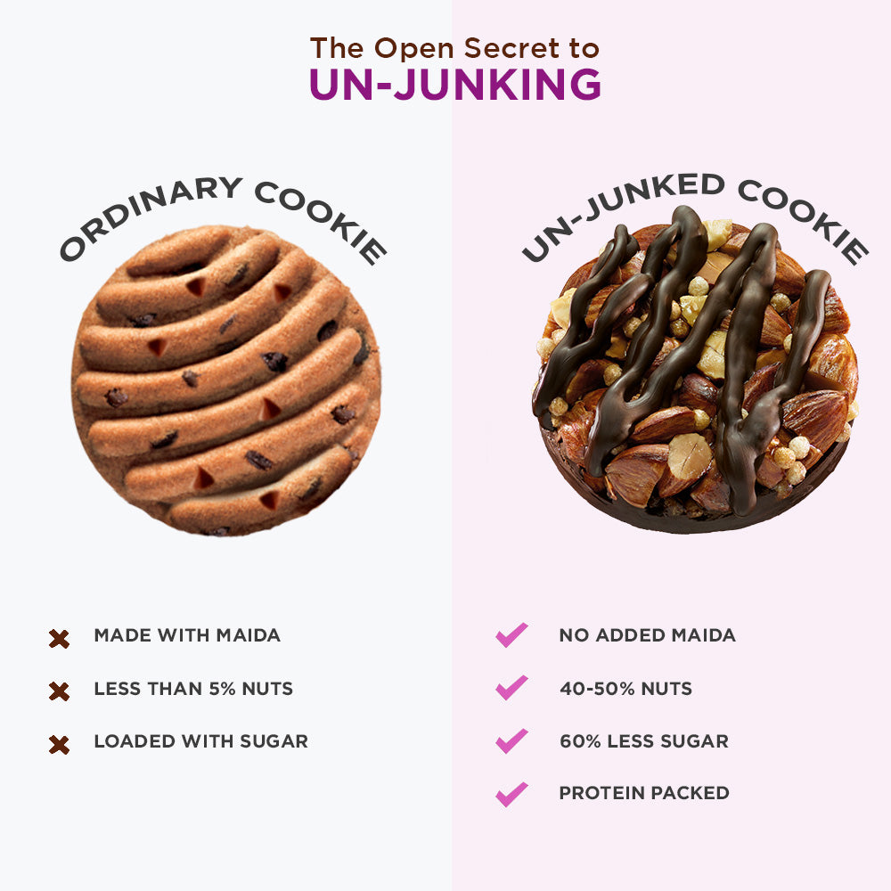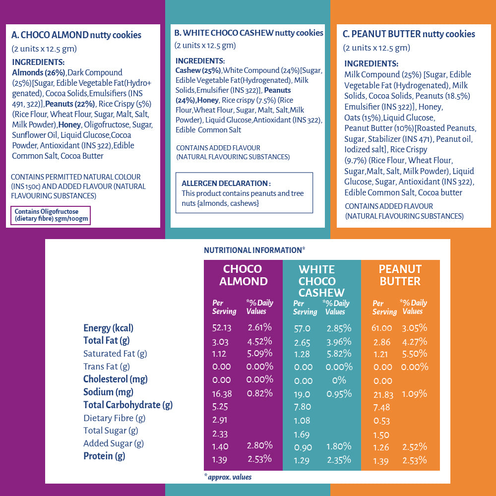 - 1 Celebration Gift Box with 12 Assorted Handcrafted Nutty Cookies in the flavors- Choco-Almond, Peanut Butter, and White Chocolate Cashews (4 cookies each).