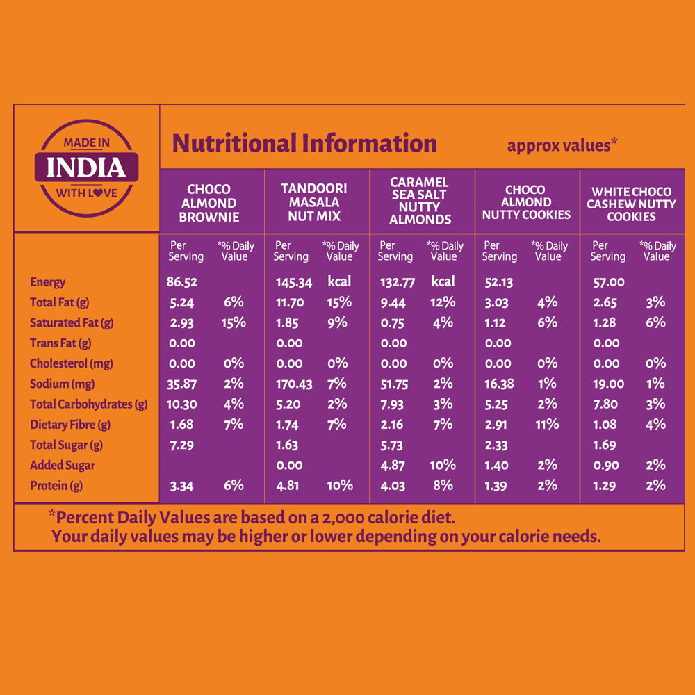 - Choco Almond Brownie: Skimmed Milk Powder, Jaggery, Cocoa Powder, Almonds
